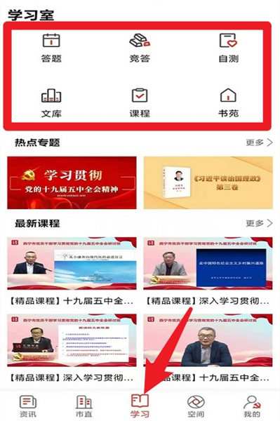 1. 轻点下方“学习”按键,即可进入学习室。学习室内设有答题、自测、课程、书苑等各类学习模块,全方位满足多样化的学习需求。