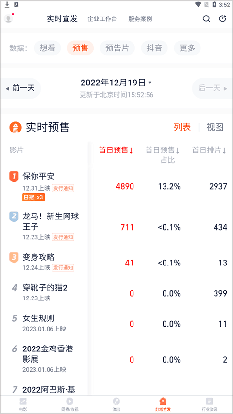 3、每日票房情况自动展示,包括总出票数、场次以及评价票价等信息。