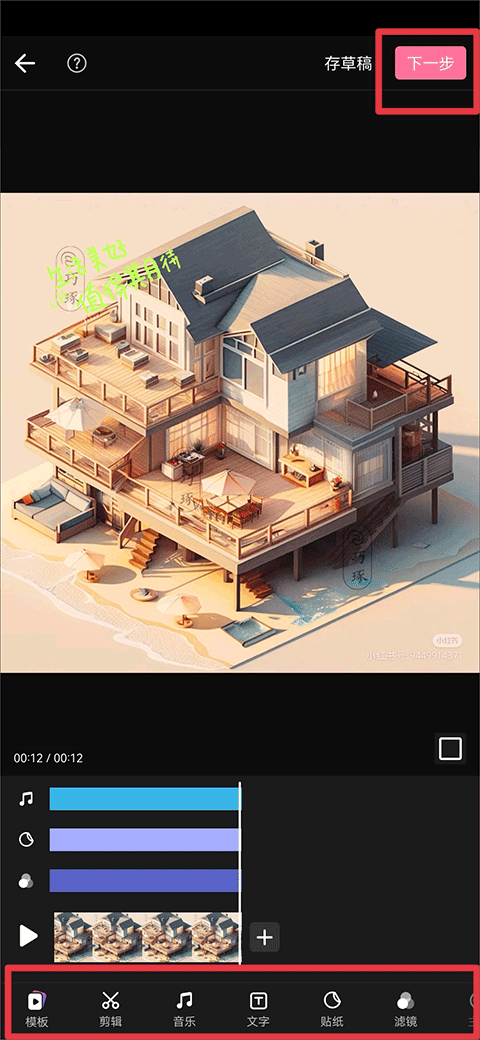 3、完成选择后,利用下方的编辑工具对图片、视频进行美化或剪辑。编辑结束后,点击“下一步”。