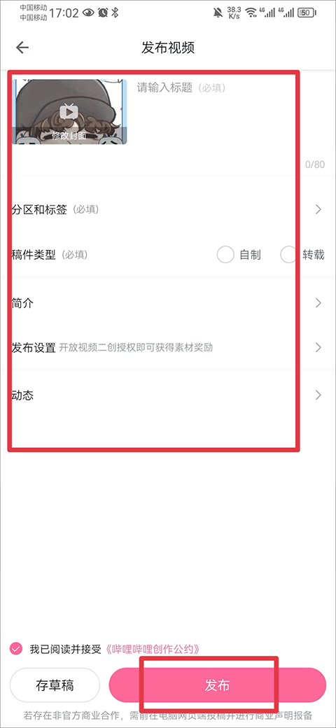 4、最后在视频发布界面,完成稿子标题、标签、类型、简介以及动态的编辑后,点击发布即可。