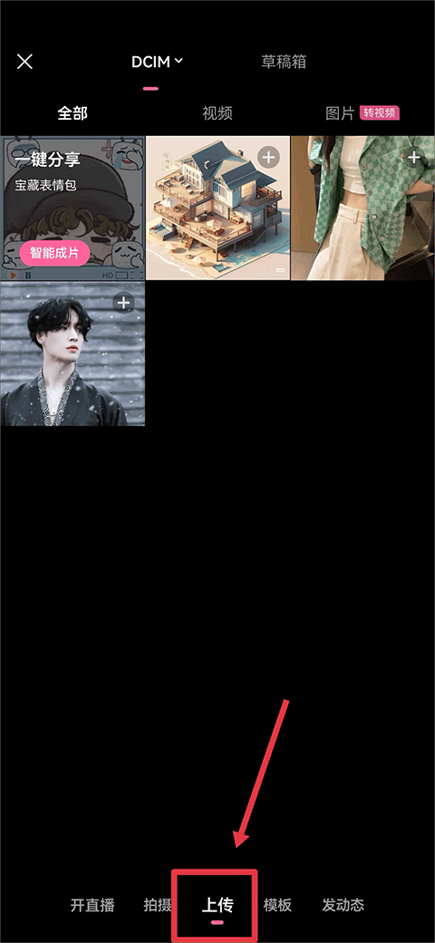 3、点击之后,页面会跳转至相册。接着在相册里挑选你打算投稿的图片或视频,按照方法一的步骤对图片进行剪辑,完成后发布即可。