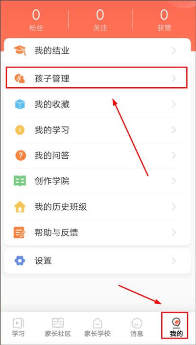 4、若家长育有多个孩子,可在【我的】界面,点击【孩子管理】-【添加孩子】,输入孩子所在班级的班级码,重新完成入班操作。