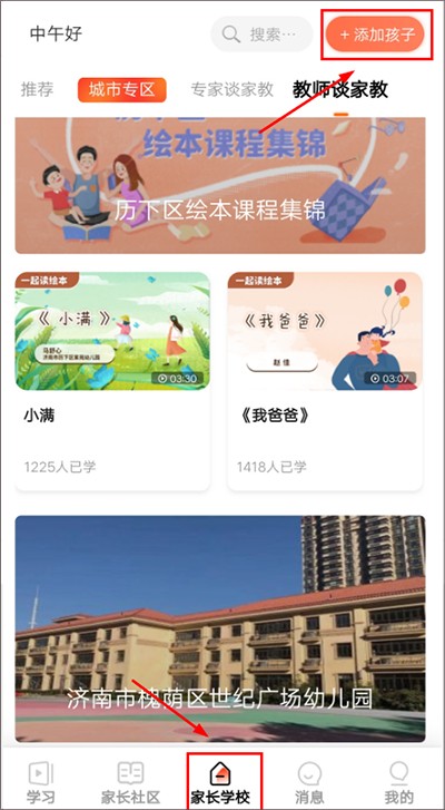 3、当您进入家长空间后,在【家长学校】板块,点击右上角的【添加孩子】选项,接着填写班级码,即可进入班级家长群。