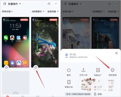 1第一步,挑选一台云手机,点击预览视图左下方的齿轮图标,这样就会弹出云手机管理功能窗口,在其中找到授权管理。