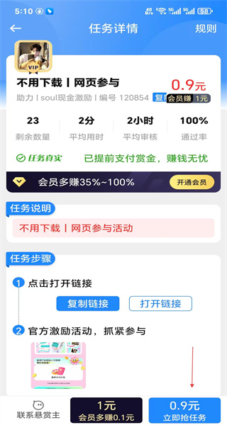 2. 无需通过网页,直接进入任务详情页,页面会展示奖励信息,此时箭头指向“立即抢任务”按钮,做好准备参与该任务。