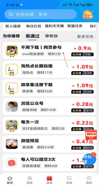 1. 打开软件,首页会呈现多款任务以及对应的奖励,箭头所指为通过不同网页参与任务,点击任务即可进入其详情页。