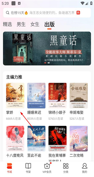4、转到出版分类页面,进入主编力荐板块,在此能看到多部出版类作品以及相应的在读人数,接着浏览这些出版类读物。