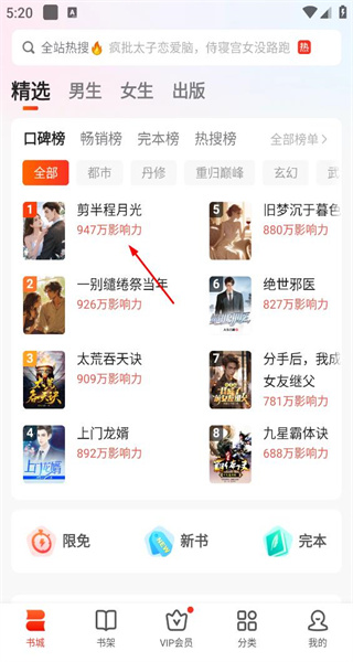 1. 打开软件,进入精选分类页面,在口碑榜板块会看到展示着多部作品及其对应的影响力,随后浏览这些精选类别下的读物内容。