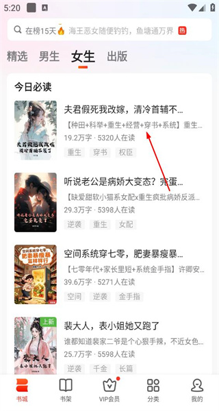 3、转到女生分类页面,进入今日必读板块,查看重生穿书等题材的作品以及在读人数,并浏览这些面向女生的读物。