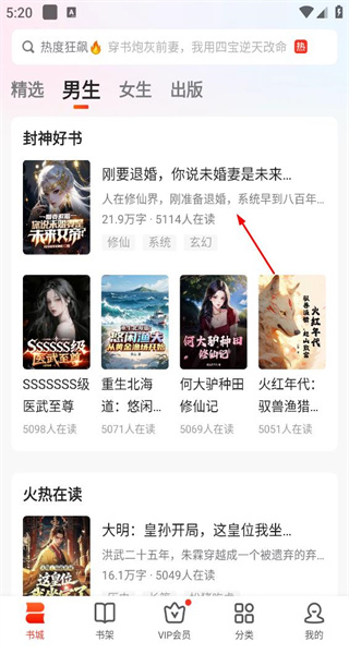 2. 切换到男生分类页面,进入封神好书板块,便能看到多部修仙玄幻类作品以及它们的在读人数,接着浏览这些面向男生的读物。