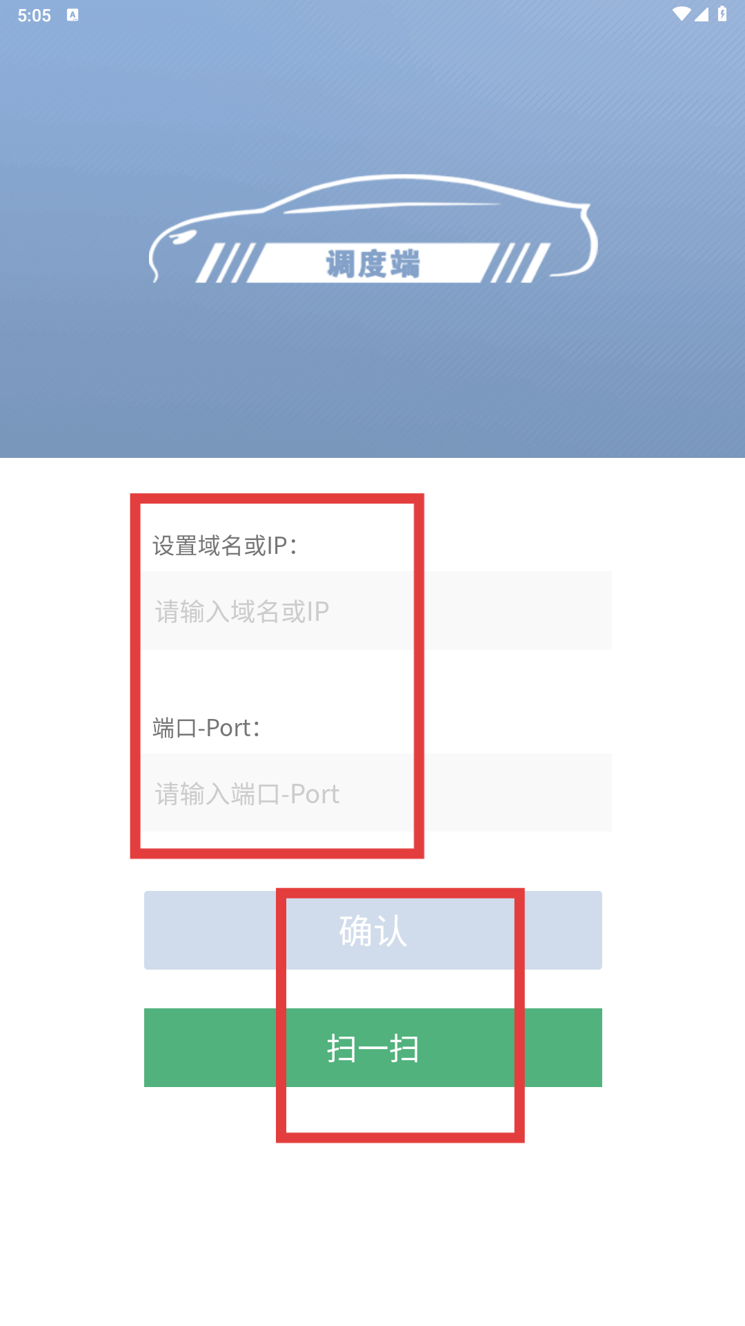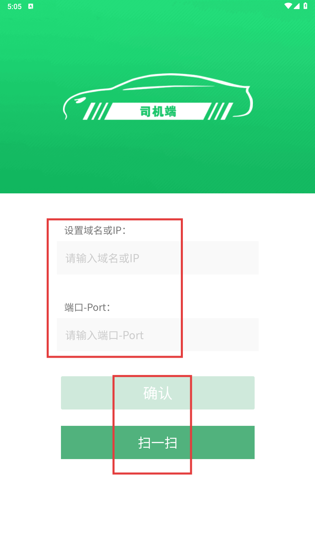 3、打开【司机端】界面,在相应位置填写【域名或IP】以及【端口 - Port】的内容,随后可通过点击【确认】按钮,或者使用【扫一扫】功能来完成配置。