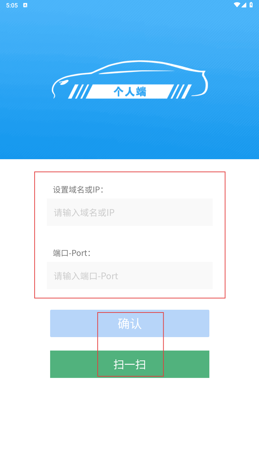 2、于【个人端】界面,填入【域名或IP】以及【端口-Port】相关信息,之后可通过点击【确认】或者【扫一扫】来完成设置。