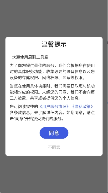 1、用户需先在本站的周到工具箱中,同意隐私政策及用户协议。