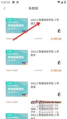 1第一步,先切换到课程板块,在系统班里找到2022上零基础快学班小学语文,接着进入详情页面查看课表。