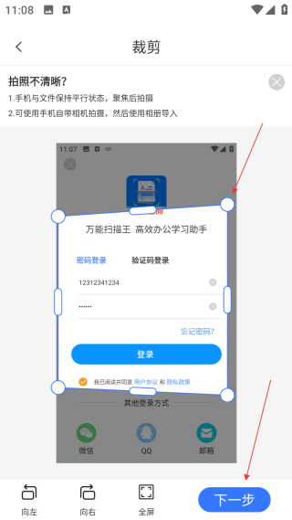 3、于裁剪页面,完成【调整文件区域】操作后,点击【下一步】,即可进入文件扫描的编辑阶段。