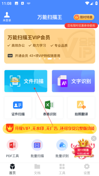 1. 打开万能扫描王,在其首页找到并点击【文件扫描】选项,随即进入与之对应的扫描操作界面。