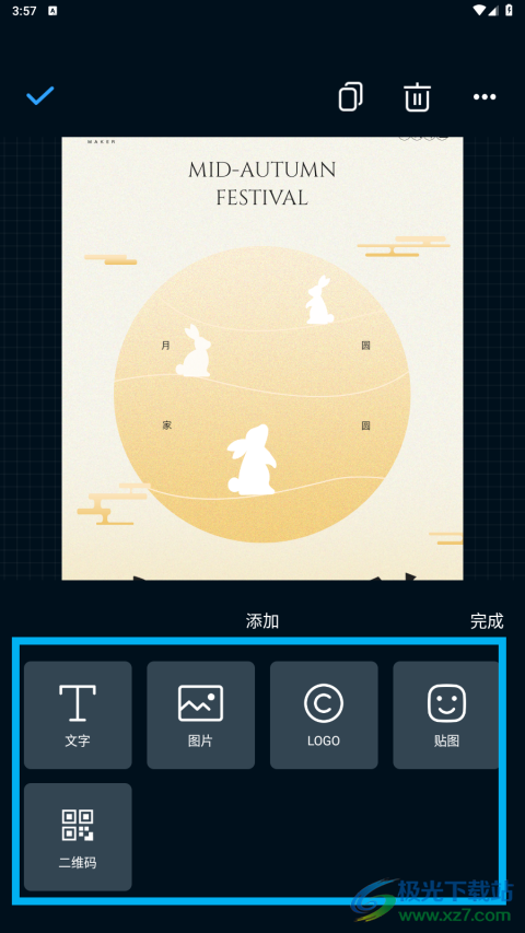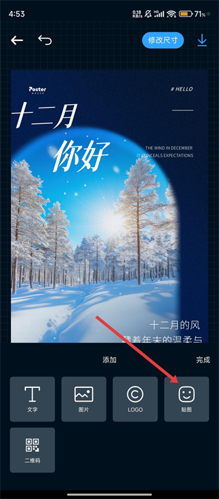 3、于模板编辑页面,轻点底部的【贴图】选项,就能往海报里添加装饰元素啦。