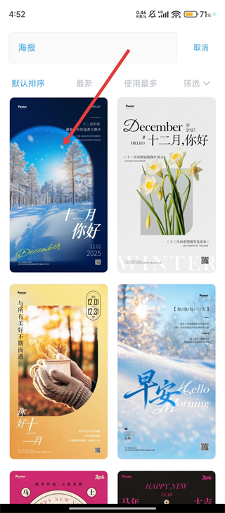 2、接下来在海报模板列表中,挑选目标模板,例如十二月主题款,点击后即可进入编辑页面。