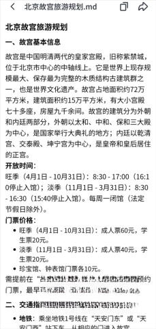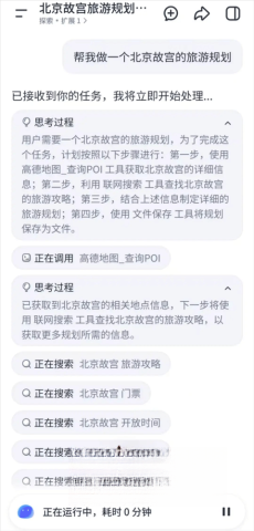 打个比方,当我在对话框中输入“帮我做一个北京故宫的旅游规划”,同时选定探索模式,并且添加高德地图MCP后,任务就直接交由扣子来决定。不出几分钟,扣子就能生成一份详尽的旅游攻略,着实方便极了!
