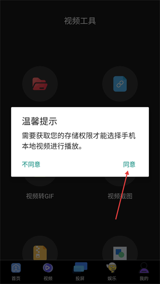 2、点击【温馨提示】弹窗中的【同意】按钮,即可授予存储权限并进入视频选择页面。