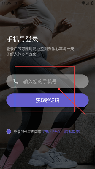 1. 在【手机号登录】页面,填入手机号后点击【获取验证码】,就能获取验证信息。此应用主要聚焦于心率监测以及运动相关功能。