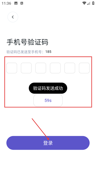 2. 在【手机号验证码】页面,填入收到的6位验证码,接着点击【登录】按钮,就能完成账号登录流程。
