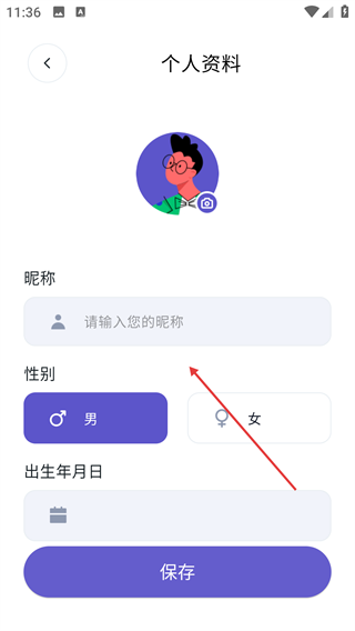 3、点开【个人资料】页面,在填写【昵称】、挑选【性别】、设定【出生年月日】之后,点击【保存】按钮,就能完成个人信息的完善。