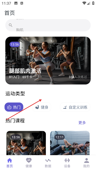 4、在【首页】页面,能够借助【运动类型】对课程进行筛选(例如【热门】【健身】),还能直接选取【热门课程】里的内容开启运动训练。