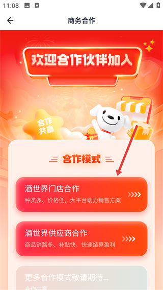 3进入商务合作界面后,可在【酒世界门店合作】与【酒世界供应商合作】两个选项中择一,进而了解详细的合作规划。