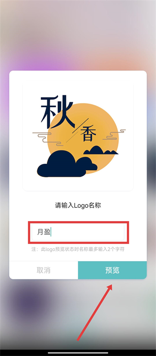 2、在输入框中填入Logo名称,像【月盈】,然后点击【预览】,看看效果如何哦。