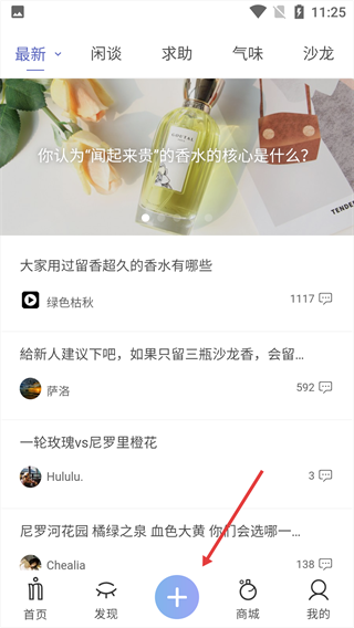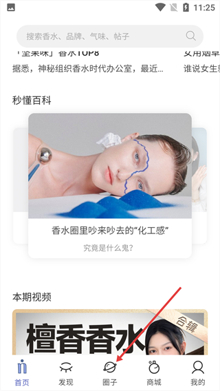 1、打开,点击“圈子”选项,进入香水主题的圈子交流页面。