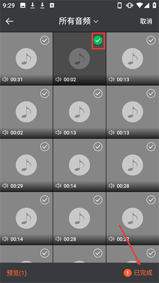 3、于【所有音频】界面,选中所需音频,接着点击【完成】按钮,便可确认选择。
