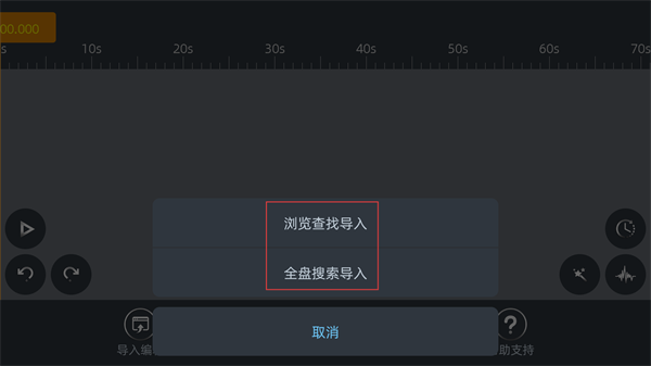 4可通过“浏览查找导入”或“全盘搜索导入”这两种方式,将待编辑的音频文件导入进来。