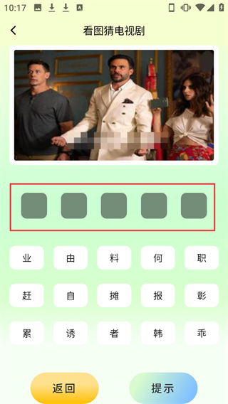 4、于看图猜电视剧的答题界面,选取相应文字填至空格区域,便可完成此关卡的猜剧答题操作。
