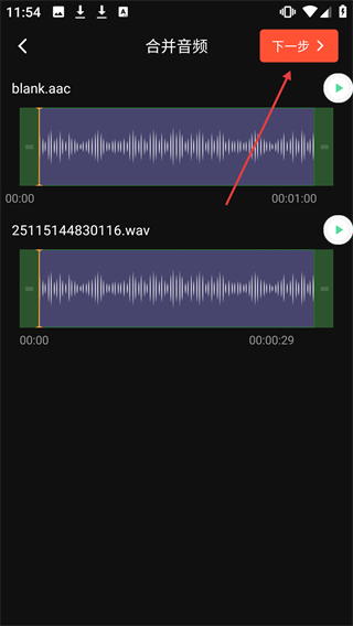 3当操作至音频合并的编辑页面时,点击界面右上角的【下一步】选项,即可跳转至音频试听的环节。