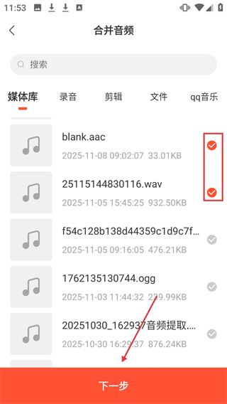 2在“合并音频”的媒体库界面,勾选需要合并的音频文件后,点击【下一步】按钮。