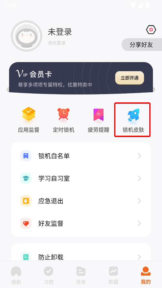 1、进入“我的”界面,点击“锁机皮肤“