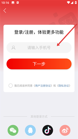 3、来到登录或注册页面,于输入框内填入手机号码,然后点击【下一步】。