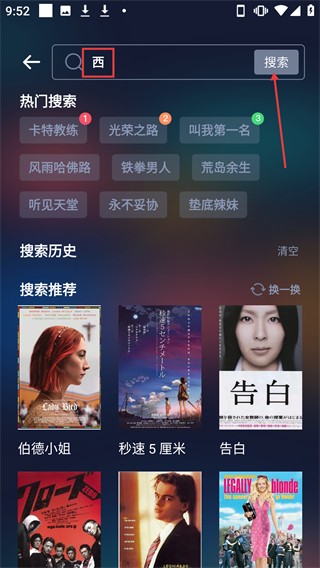 2. 在搜索页面的输入框内填入“西”,接着点击右侧的搜索按钮,便能触发搜索操作。