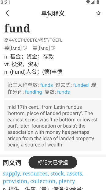 2. 在学习界面查看单词的释义、读音及例句内容,以助于理解词汇的用法。