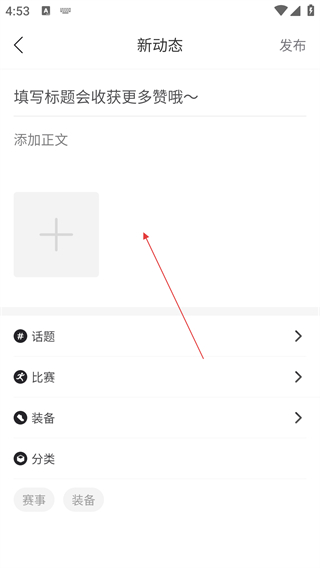 4、进入新动态编辑页面后,填写标题并添加正文内容。若要添加图片素材,可点击【+】图标,完成上述操作后,即完成动态编辑。
