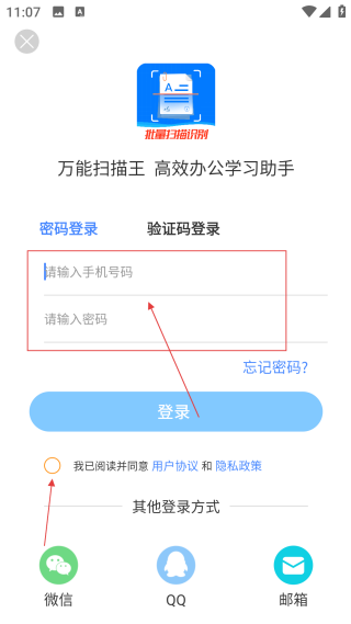 3、在登录页,填写【手机号码与密码并勾选协议】。