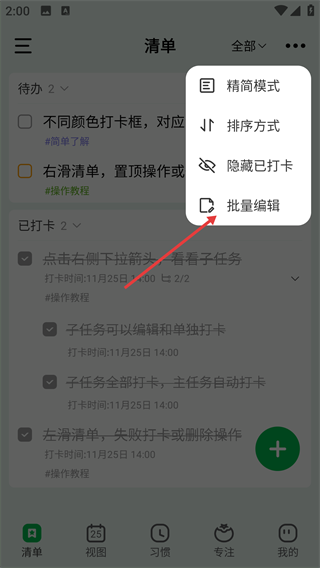 1. 在清单页面,轻点右上角的三点图标,使功能操作菜单展开。
