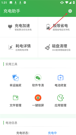 1、打开【充电助手】主界面后,点击右上角的设置图标,即可进入设置页面。