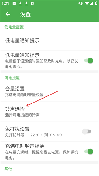 2、进入【设置】页面后,点击【铃声选择】选项,即可进入铃声选择界面。