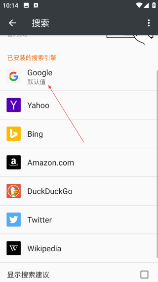 4、进入搜索设置页面后,选中【Google】,就能把它设置为浏览器的默认搜索引擎。
