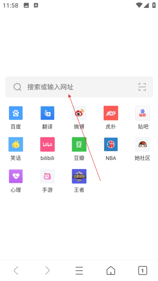1. 于浏览器首页,点击【搜索或输入网址】框,使搜索输入功能被激活。