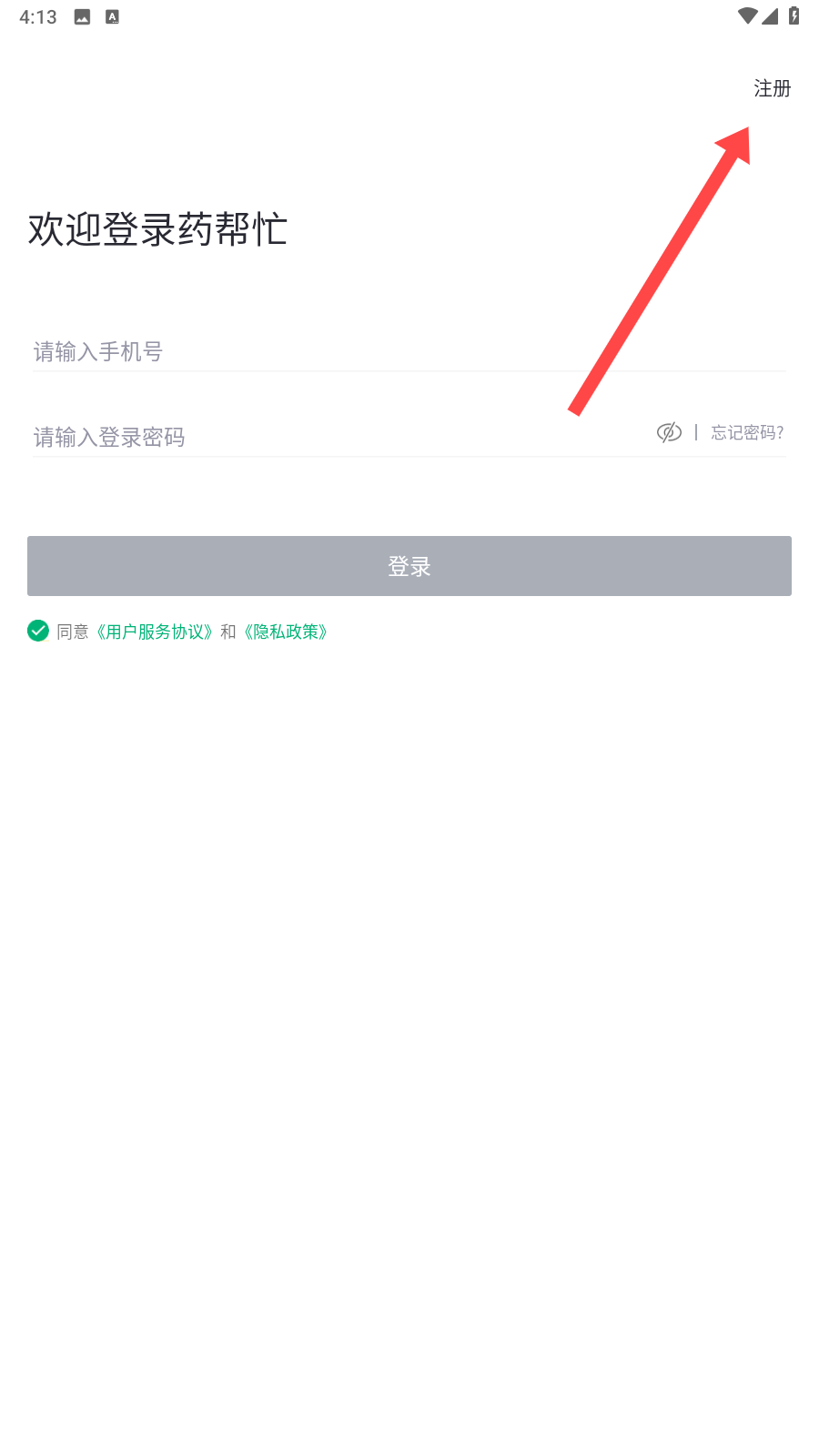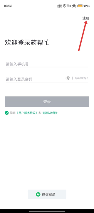 1. 首先,打开药帮忙的登录界面,在该界面的右上角寻找【注册】按钮,找到后点击它,就能顺利进入注册页面。