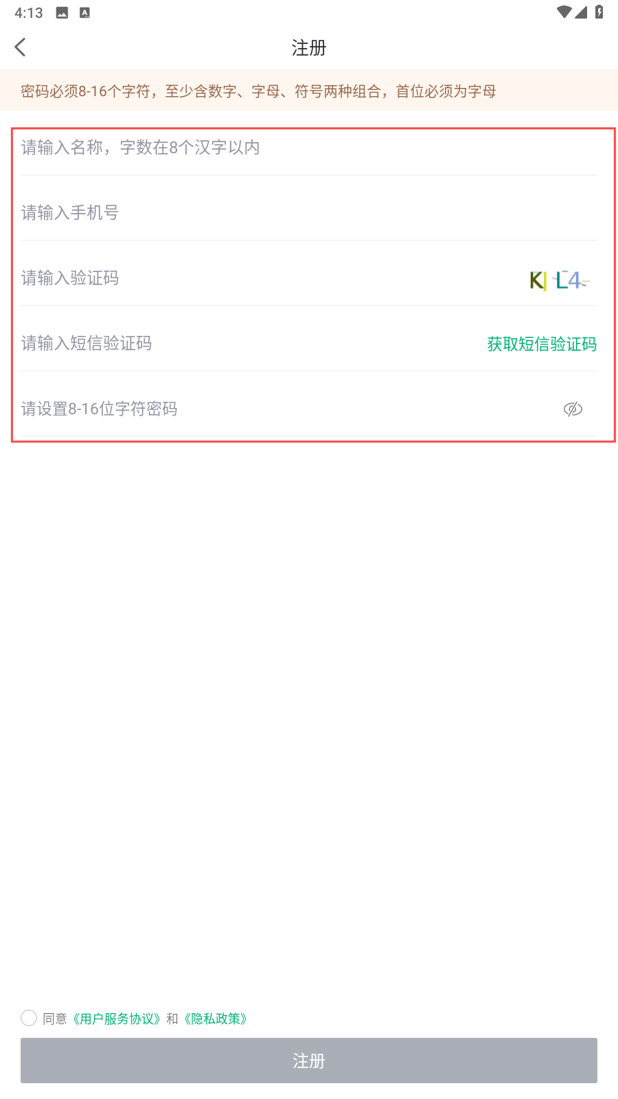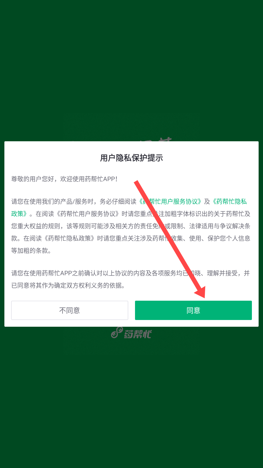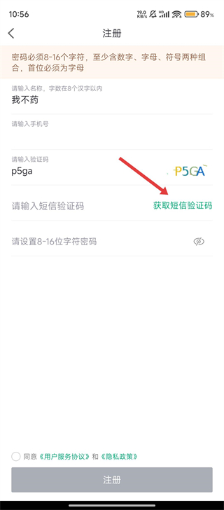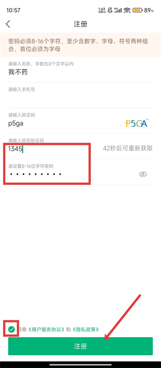 4、填入【短信验证码】,设定【8 - 16位字符密码】,勾选相关协议后,点击【注册】按钮,就能完成药帮忙账号的注册。