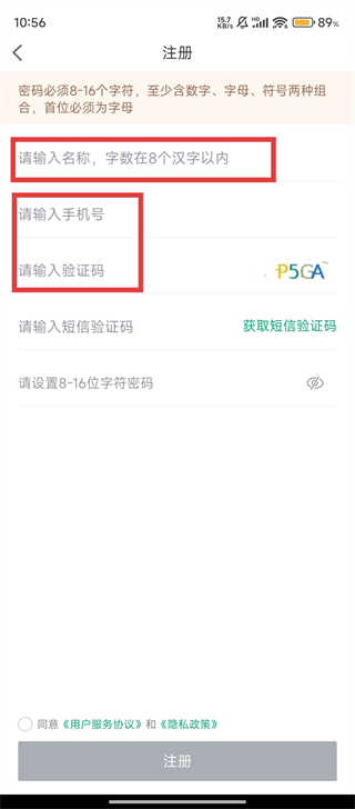 2、随后要填写【8字内名称】,输入【手机号】,接着填写页面所示图形【验证码】。